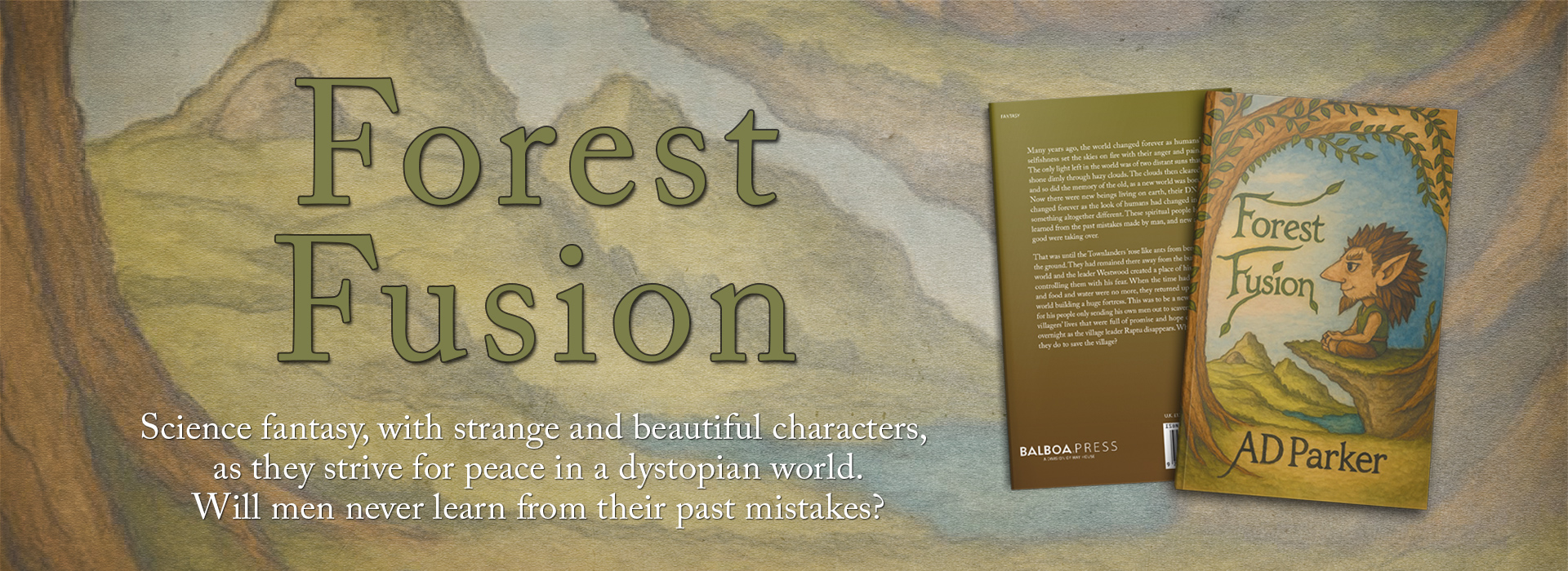 AD Parker is the writer of Forest Fusion. This story is the first of many. This world is set many generations after the last wars. This dystopian future is full of quirky imagination with characters to match, and as a reader I hope that you change the words and the artwork into your own visual fantasy. Starting writing at the age of twenty-five and attending many writing courses over the years, to my surprise I found my old English school book. Unknown to me back then, Forest Fusion was already in motion.